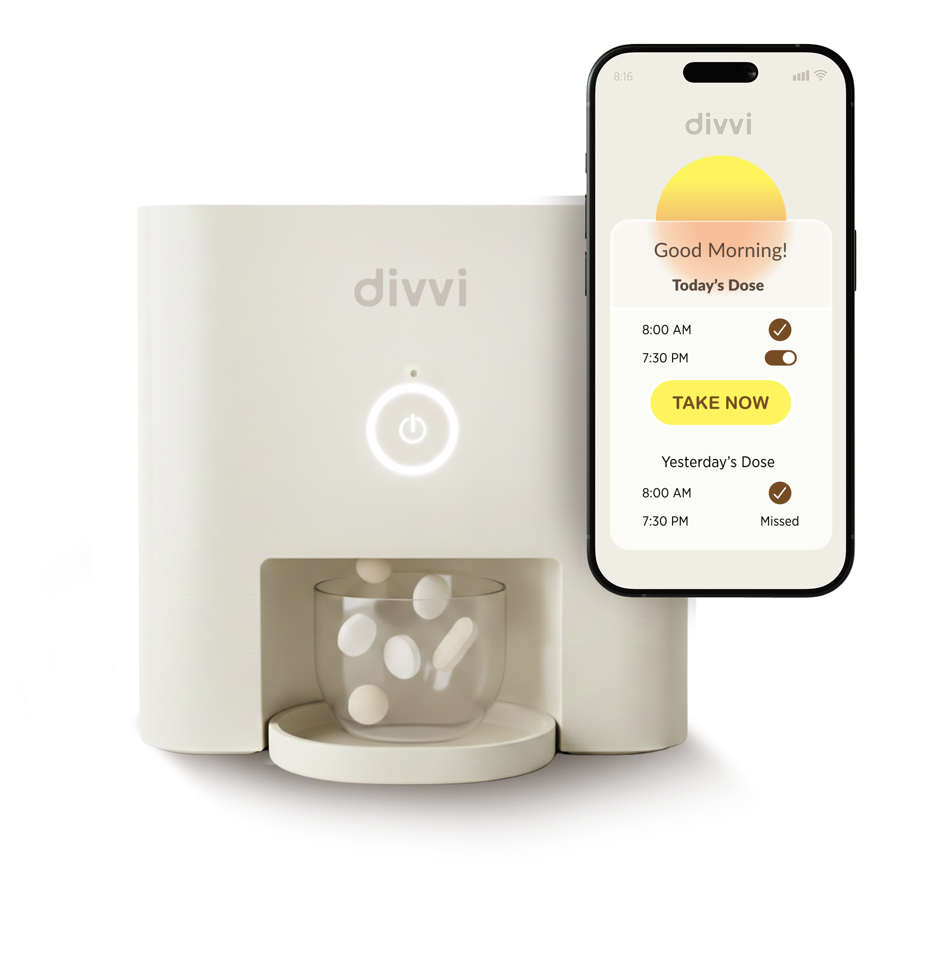 Divvi brings calm structure to daily routines, automatically dispensing medications and supplements so you don't have to think about it.