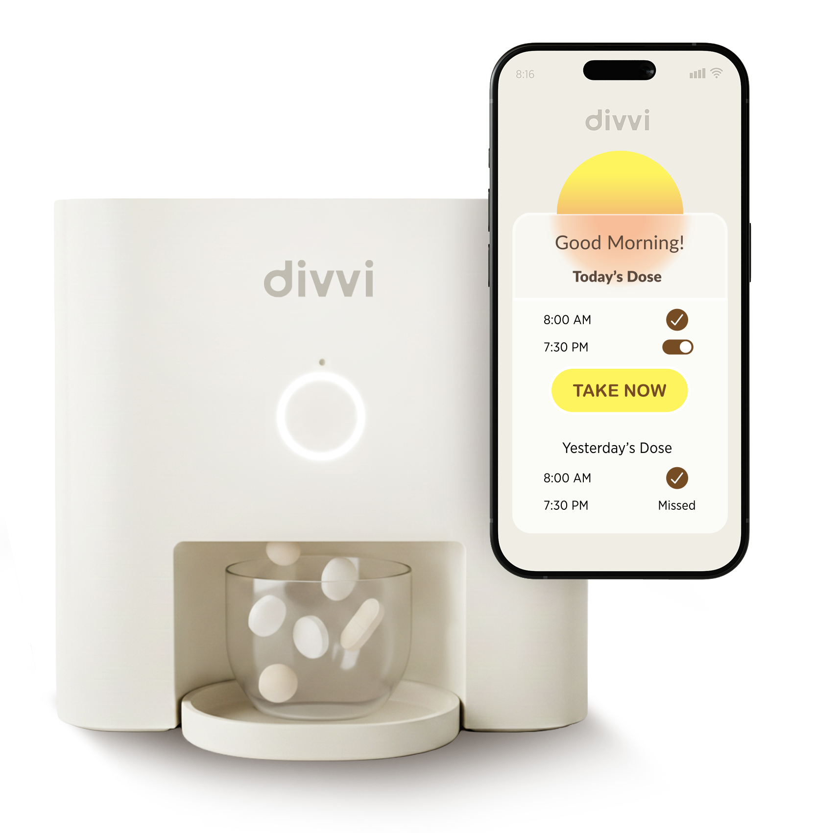 Divvi is a home device that organizes and dispenses the medications you already take.